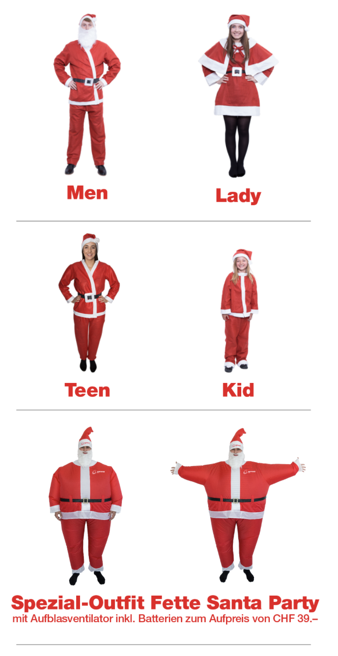 The entry fee includes a Santa outfit, a souvenir gift and a great atmosphere. For participants with their own Santa outfit, the entry fee is reduced by CHF 10. When registering, you choose one of the following four models. You can also choose a special outfit for a surcharge of CHF 39. The Santa outfits will be handed out to you in the marquee on the Bundesplatz.