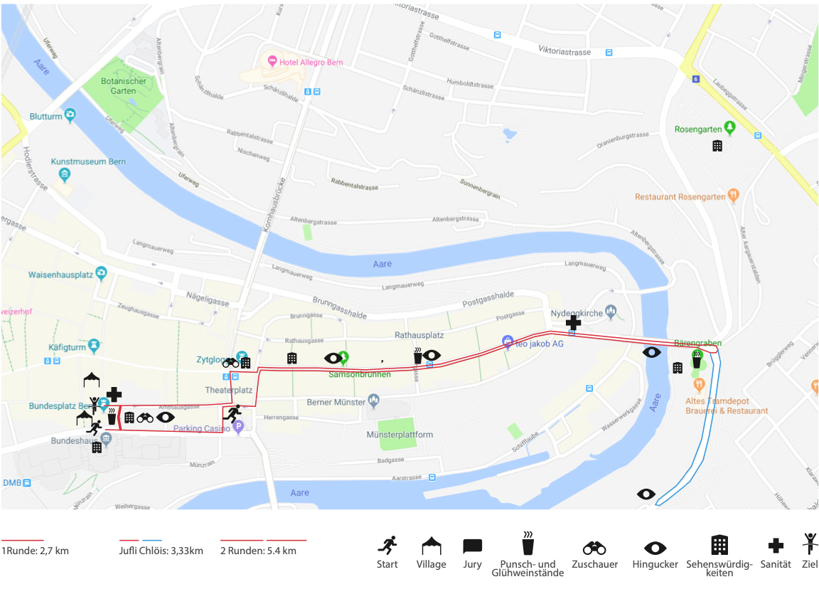 The leisurely route of the Chiller-Chlöis (2.7 km or 5.4 km) can be completed by jogging, walking or crawling as you wish. The Jufli-Chlöis complete the distance of 3.333 km.